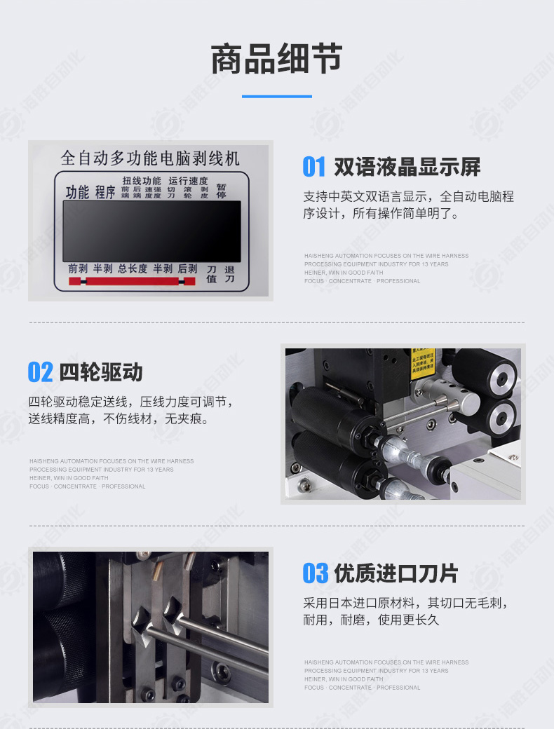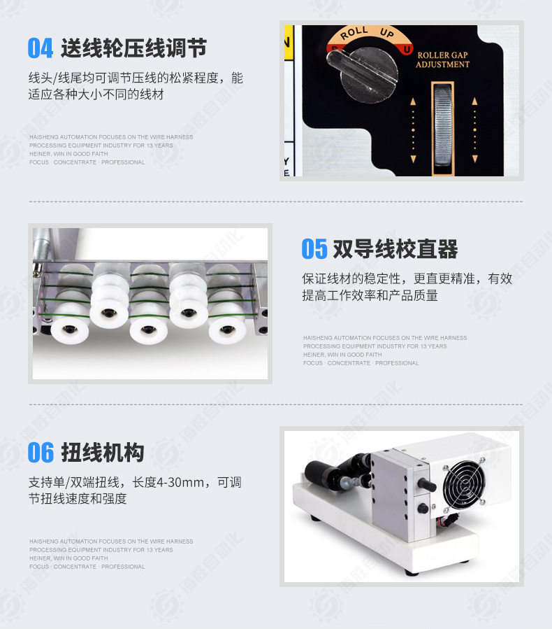 本機采用新的32位Cortex-M3處理器,步進驅(qū)動,運行速度快、產(chǎn)量大、公差小、故障率低、品質(zhì)量管制優(yōu)良。全自動剪裁、半剝、全剝、扭線、多段剝皮加工一次性完成,多種工作模式隨時切換,100條記憶程序可保存,省時方便操作。同時本機支持四線加工,大大提高效率,節(jié)約時間成本。適用電子線、硅膠線、鐵氟龍線、玻璃織維棉、隔離線、同軸線等4平方以下線材加工需求。